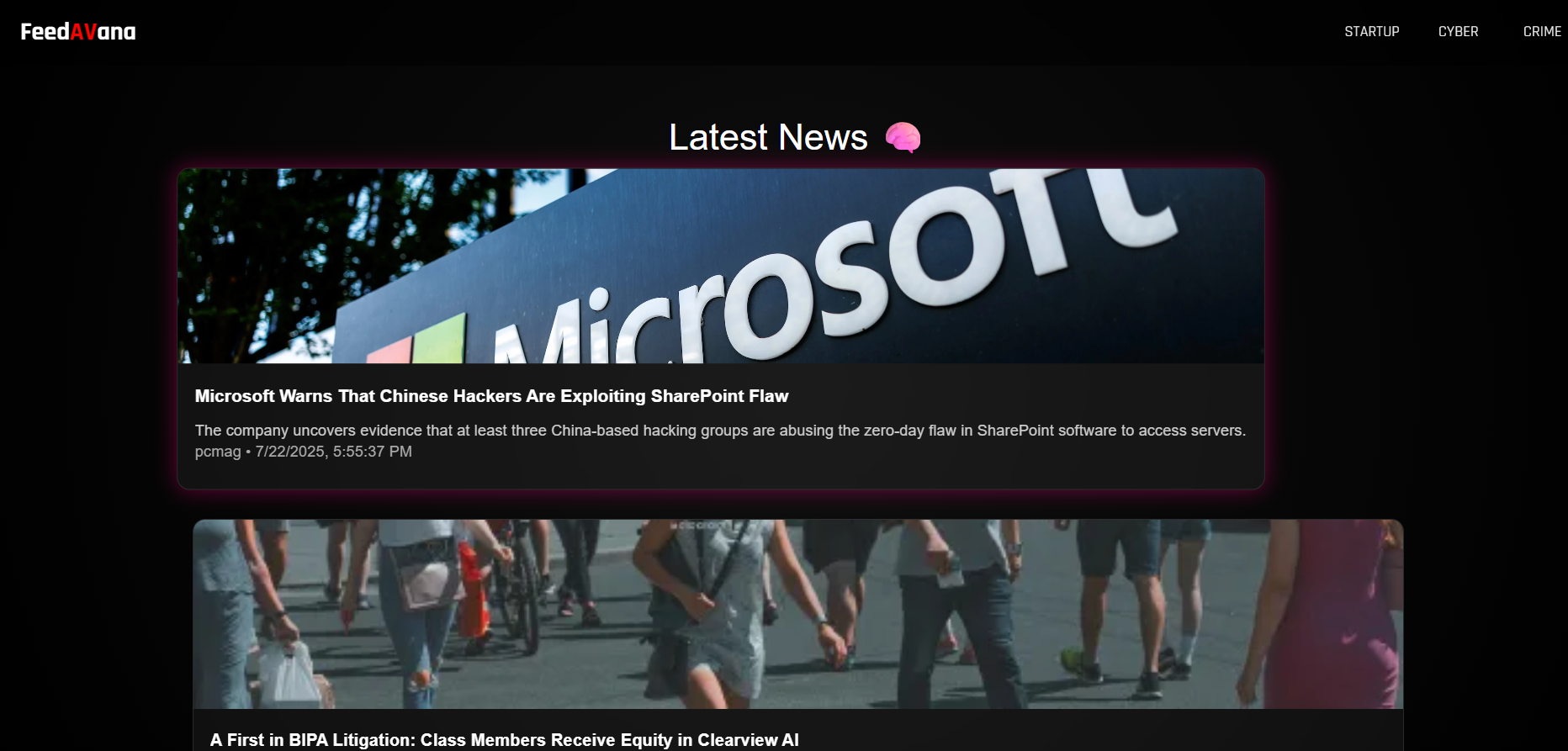 A news website with cyber and startup with crime headlines.